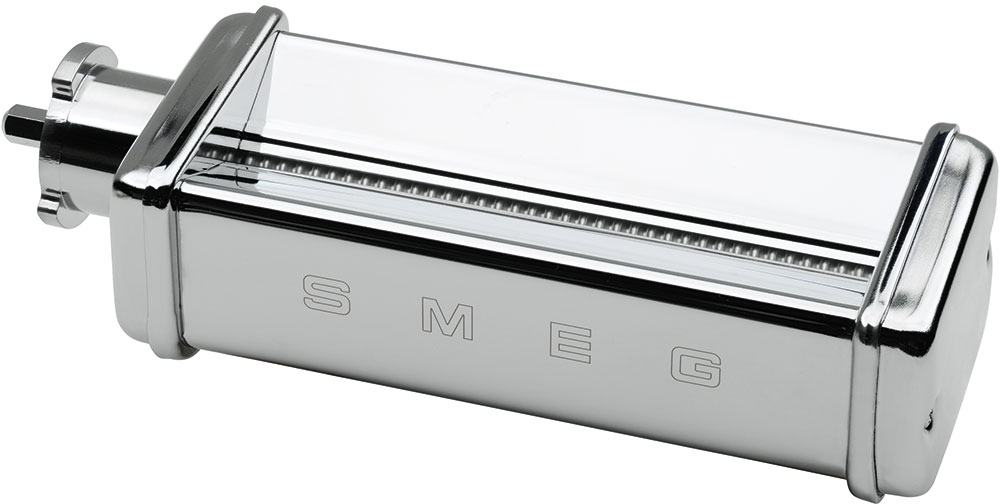 Accessoire coupe-spaghetti pour robot pâtissier Smeg style années 50, avec corps en acier chromé et rouleaux en alliage d'aluminium anodisé, pour obtenir des pâtes fraîches maison de différentes formes.En savoir plus
