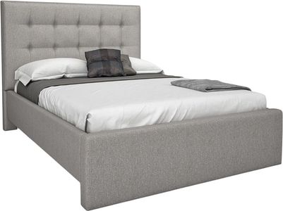 Ce lit Chelsea est composé d'une tête de lit capitonnée, de côtés de lit capitonnés, d'une plateforme en panneaux de particules et d'un pied de lit Absolu.