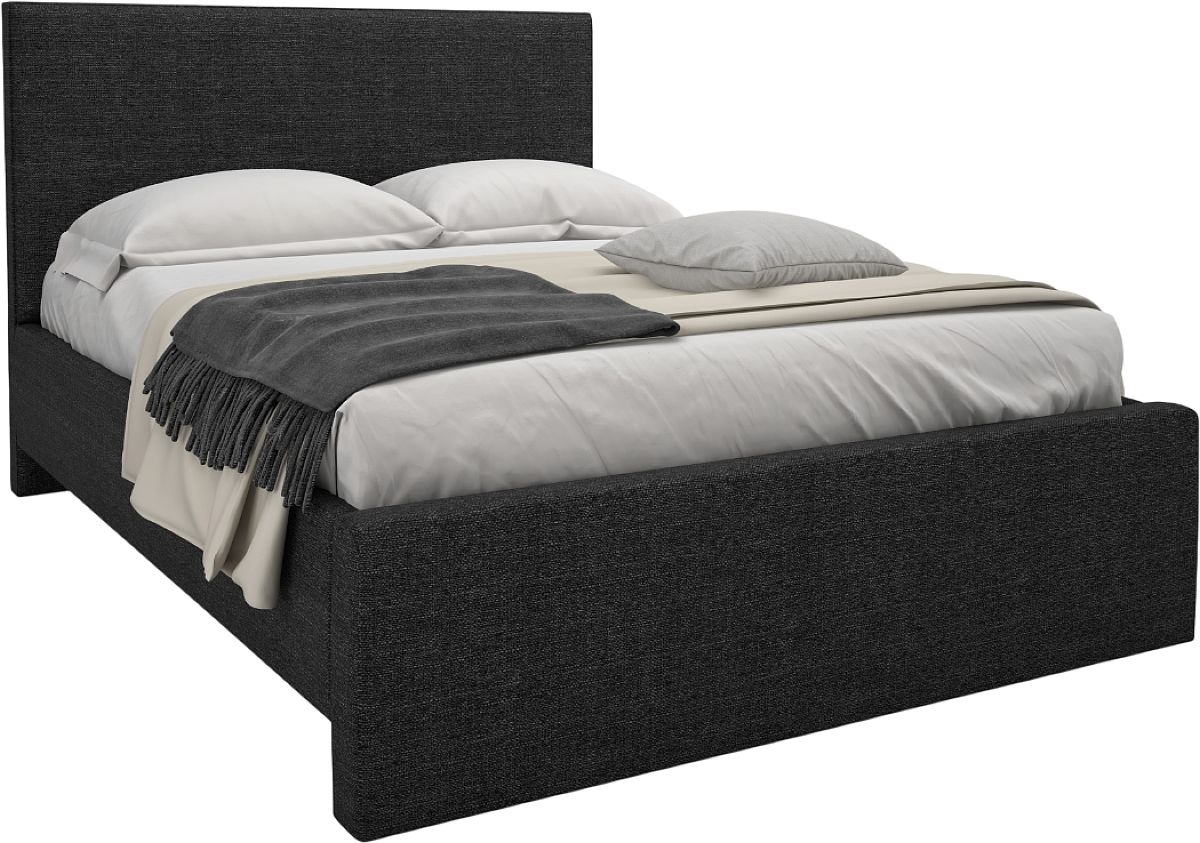 Ce lit Jane est composé d'une tête de lit capitonnée, de côtés de lit capitonnés, d'une plateforme en panneaux de particules et d'un pied de lit Absolu.